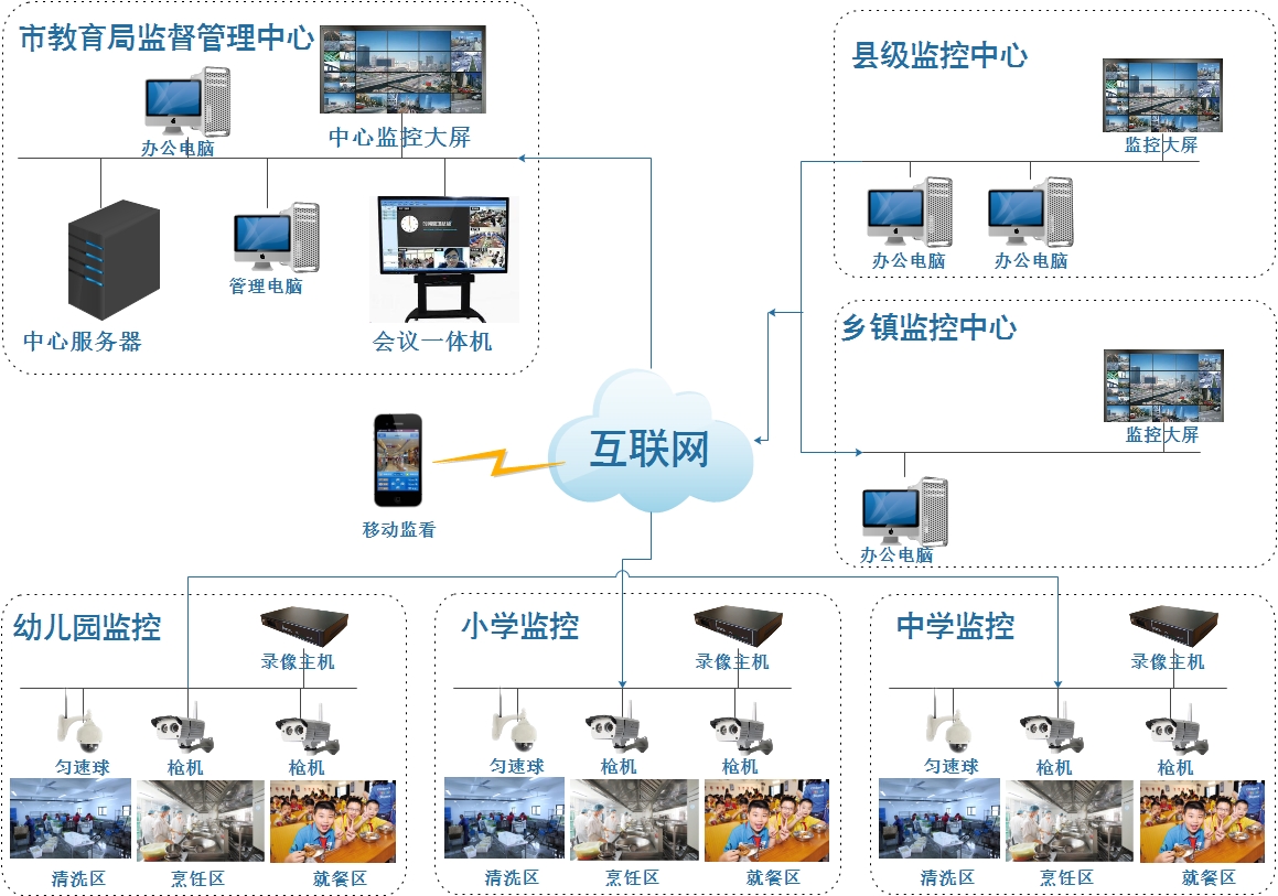 针对层出不穷的校园安全事件,为遏制校园食品安全事件为根本目标,云眼微视结合自身的优势提出了学校厨房联网监管解决方案,由食品安全管理已是教育局主管部门牵头,监控摄像机直播 在各中小学、幼儿园食堂餐厅、仓库、餐饮具消毒清洗区、面点制作加工区、烹饪区、切配区和粗加工区等重要区域安装高清网络摄像机,通过网络将视频资源传输到教育局监管中心平台,系统应用了多种先进技术:云监控、P2P、Web服务、微内核、插件、门户技术等;具有操作简单、报警及时、回放快速、图像清晰、压缩比高、独立性强、高度保密、多路同时捕获等特性,良好的框架结构能满足目前以及将来视频集中监控的各种需要,是一套功能强大、运行稳定的网络视频监控管理系统。采用集中式管理、服务器转发、分布式部署监控系统,设立一个监控总中心和多个(多级)监控分中心。